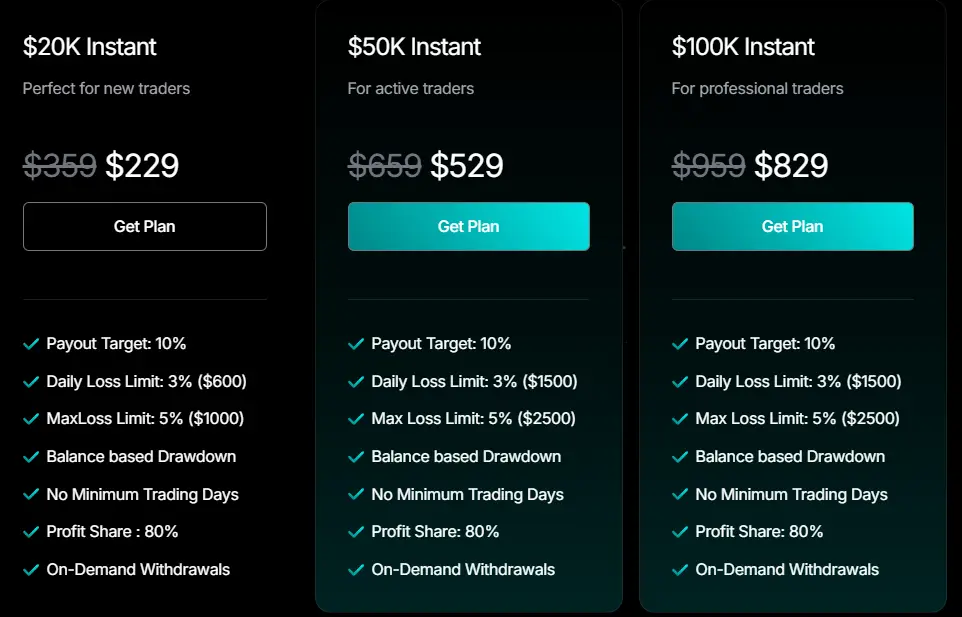 Pick your plan, get funded instantly, and trade from day one. No challenges, No delays, just profits made simple.